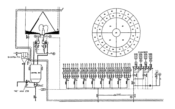 它的均化機(jī)理是生料粉由庫(kù)頂生料分配器通過(guò)8條卸料斜槽,在庫(kù)頂成徑向分布,不同時(shí)間的生料在不同的料層上具有徑向均化的效果,庫(kù)底充氣系統(tǒng)設(shè)計(jì)呈放射狀斜向分布,更符合生料粉的流動(dòng)傾向。環(huán)形區(qū)一般分為8個(gè)充氣單元區(qū),可每隔5-10分鐘循環(huán)一次,環(huán)形區(qū)的生料因松動(dòng)及氣流的引導(dǎo)流向中心區(qū),庫(kù)內(nèi)的卸料過(guò)程是成柱狀流動(dòng)切割水平面料層的生料粉,讓不同時(shí)間的生料粉進(jìn)入中心區(qū),由于中心區(qū)的充氣強(qiáng)度大,不同時(shí)間的生料粉進(jìn)入中心區(qū)后得到充分的攪拌,從而達(dá)到理想的均化效果。功率消耗0.1-0.3kW/t,具有較高的均化比。