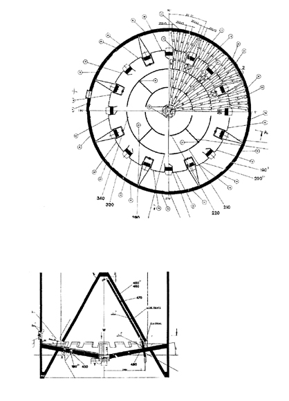 CP生料均化庫(kù)是南通江森機(jī)械制造有限公司引進(jìn)德國(guó)BMH公司一種新型生料均化庫(kù),其特點(diǎn)是電耗低,均化效果好。CP生料均化庫(kù)的均化原理是庫(kù)頂生料通過(guò)8條斜槽均勻布料,不同時(shí)期的生料在庫(kù)內(nèi)呈橫向分布,庫(kù)底充氣系統(tǒng)設(shè)計(jì)更符合生料充氣后的流動(dòng)性,呈放射狀斜向分布,環(huán)形區(qū)一般分8個(gè)區(qū),每隔5分鐘輪流充氣,充氣區(qū)生料因松動(dòng)及氣流的引導(dǎo)卸入中心區(qū),庫(kù)內(nèi)不同層的生料豎向切割下料實(shí)現(xiàn)生料的均化,不同時(shí)間的生料進(jìn)入中心區(qū)后再進(jìn)行氣體強(qiáng)烈混合均化,從而達(dá)到理想的均化效果。