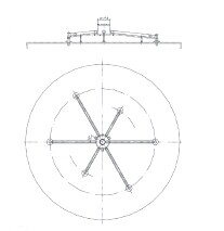 庫(kù)頂生料分配是用于生料庫(kù)或水泥庫(kù)的庫(kù)頂作為均勻布料的設(shè)備,來(lái)自提升機(jī)等輸送設(shè)備輸送過(guò)來(lái)的干燥粉狀物料,注入分配罐內(nèi),經(jīng)充氣成流化狀態(tài),通過(guò)徑向伸出的空氣輸送斜槽向各點(diǎn)分布,形成多點(diǎn)分料。庫(kù)頂物料的分配一般以分配罐直徑作為型號(hào)規(guī)格,根據(jù)其出料咀數(shù)量可分為四咀、六咀、八咀三種分配形式,出料咀斜度可按工藝在6°至10°范圍內(nèi)選擇,分配生料能力在技術(shù)參數(shù)表中選取。