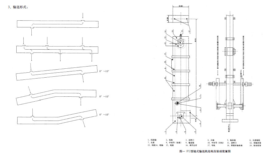 (6)FU型鏈?zhǔn)捷斔蜋C(jī)進(jìn)出口靈活,高架、地面、地坑、水平、爬坡(≤15°)均可安裝,輸送長度可根據(jù)用戶設(shè)計(jì)。